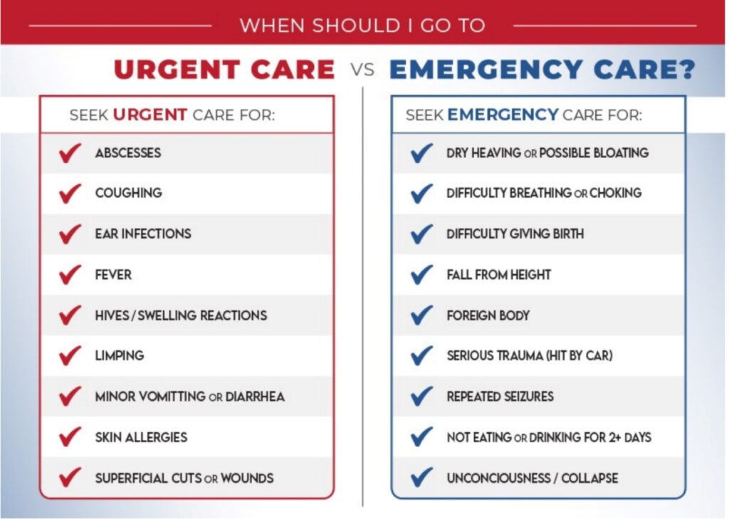 Pets should go to urgent care for problems needing immediate medical attention, even if they are not life-threatening: